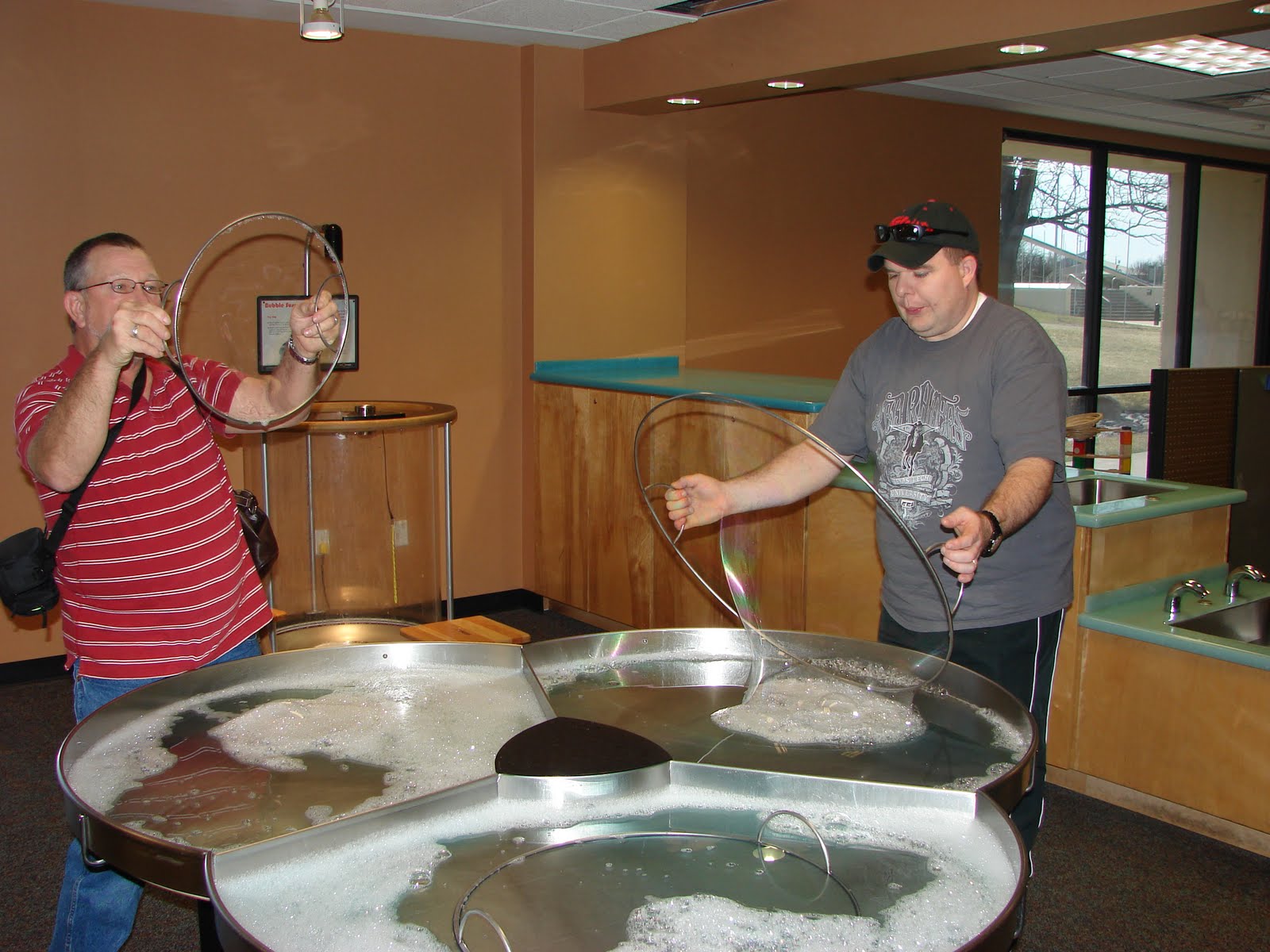 This is the tinker toy room. They have this really cool sand machine. You put sand on this wheel and it spins around. Then you can use tools to make different strokes on the wheel. There was a long line waiting to play on this cool toy. Also in the tinker toy room they had a shadow box. You go in this room with about six people and stand against the wall. Then this light flashes. Afterwards you can turn around and see your shadow. I took a picture of the kids, but they didn't really come out since it is a black room. Oh well. It is a neat exhibit though.